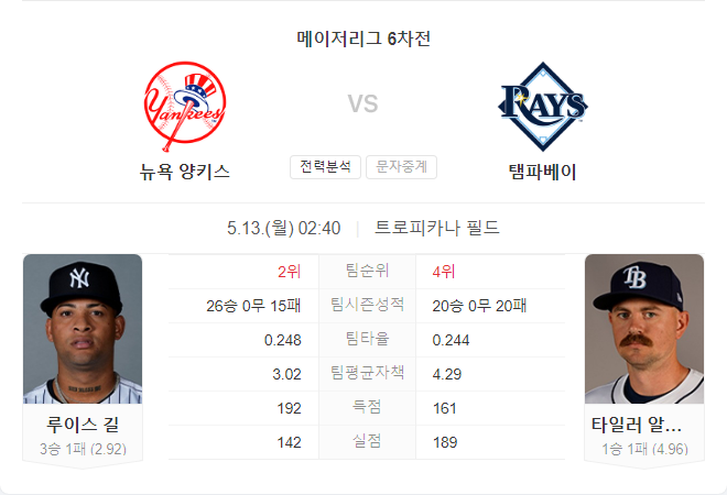 양키스와 레이스의 이번 경기는 양키스가 유리한 고지를 점할 가능성이 높습니다. 양키스는 타선과 투수진 모두에서 레이스보다 우위에 있으며, 최근의 경기력도 레이스를 앞서고 있습니다. 루이스 길의 최근 피칭은 매우 안정적이며, 탬파베이의 부진한 타선을 상대로 좋은 성적을 거둘 것으로 예상됩니다.