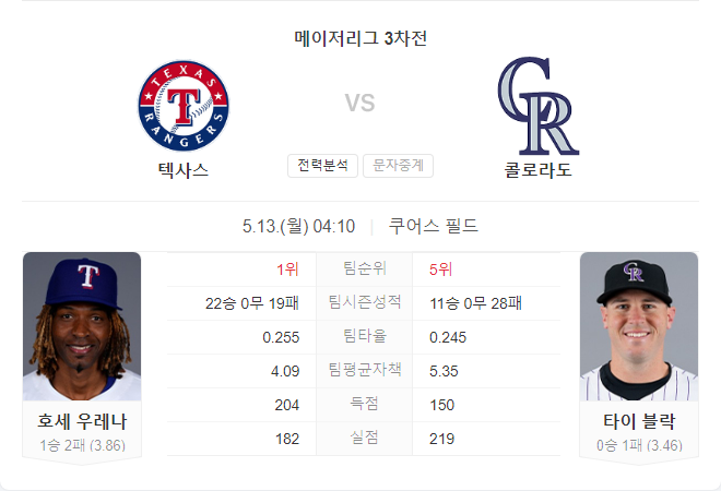 이번 경기는 두 팀 모두 최근의 경기력을 이어가기 위해 치열한 접전을 펼칠 것으로 예상됩니다. 레인저스는 원정 시리즈에서 강한 모습을 보여주고 있으며, 로키스는 홈에서 이번 시즌 첫 시리즈 승리를 노리고 있습니다. 두 팀의 선발 투수 모두 최근 경기에서는 기복을 보였지만, 레인저스의 타선이 로키스의 투수진을 상대로 우세를 점할 가능성이 높습니다.