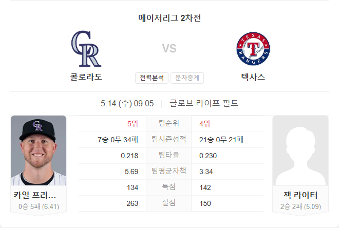5월 14일 MLB 메이저리그 콜로라도 로키스 VS 텍사스 레인저스 타카짱의 경기 예측 분석