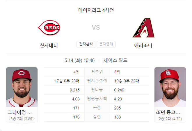 양 팀 모두 최근 부진한 모습을 보이고 있으나, 다이아몬드백스는 최근 신시내티 레즈와의 경기에서 3연승을 거두는 등 상대 전적에서 우위를 점하고 있습니다. 또한, 다이아몬드백스의 선발 투수 조던 몽고메리는 신시내티를 상대로 강한 모습을 보여주었고, 이번 홈경기에서도 그 기세를 이어갈 가능성이 높습니다.