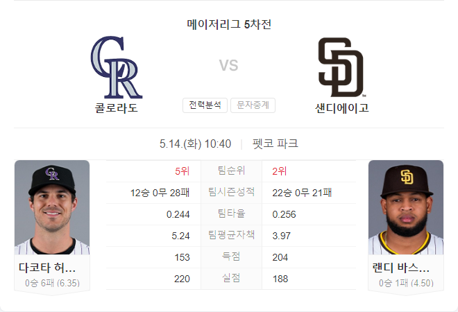 5월 14일 MLB 콜로라도 로키스 VS 샌디에이고 파드리스 타카짱의 경기 예측 분석