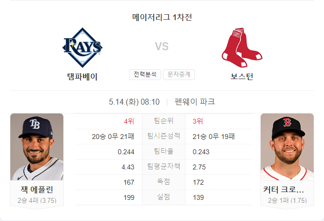 반면, 탬파베이 레이스는 잭 에플린이 원정에서의 부진을 극복하고 좋은 모습을 보여줄 필요가 있습니다. 전체적으로 보스턴이 경기 초반부터 리드를 잡고 탬파베이의 추격을 허용하지 않을 것으로 보이며, 경기는 저득점으로 흐를 가능성이 큽니다. 예상 결과는 보스턴 레드삭스의 승리입니다.