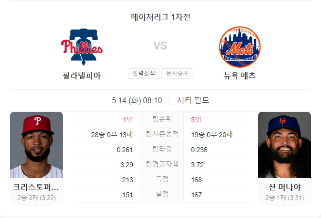 5월 14일 MLB 필라델피아 필리스 VS 뉴욕 메츠 타카짱의 경기 예측 분석