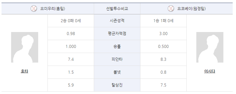 타선의 부진으로 연패에 빠진 요코하마 DeNA 베이스타즈는 이시다 켄타(1승 1패, 3.00)가 시즌 2승에 도전한다. 이시다는 8일 야쿠르트와의 홈 경기에서 5이닝 3실점으로 패배를 당했으며, 경기 초반에 무너진 것이 패인이 되었다. 작년 요미우리를 상대로 야외 구장에서 평균 6이닝 2실점으로 좋은 모습을 보였으며, 특히 4월 18일 나가사키에서 8이닝 무실점 승리를 거둔 바 있다.