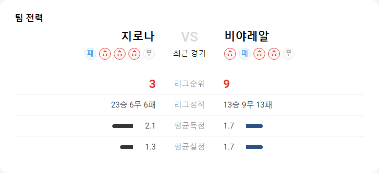 비야레알은 최근 4-4-2 포메이션과 역습 전술로 좋은 성적을 거두고 있습니다. 그러나 지로나의 강한 압박에 대응하는 능력이 다소 부족한 모습을 보이고 있습니다. 파레호는 압박에 유려하게 대응하지 못하는 편이며, 알비올은 나이가 많아 상대의 공세에 부담을 느낍니다.