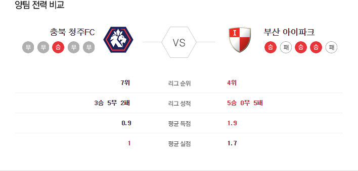 충북청주는 대한민국 2부 리그 5위에 위치하며 최근 경기에서 무무승무무의 성적을 기록하고 있다. 부산과의 상성은 비교적 좋은 편이다. 첫 만남에서는 3-6으로 크게 패했지만, 그 이후로는 모두 1-1 무승부를 기록했다. 충북청주는 조르지의 공백으로 인해 무승부 비중이 높아진 상황이지만, 부산이 까다로워하는 선수비 성향을 가지고 있다. 이는 부산의 공격을 효과적으로 차단할 수 있는 전략이 될 것이다.
