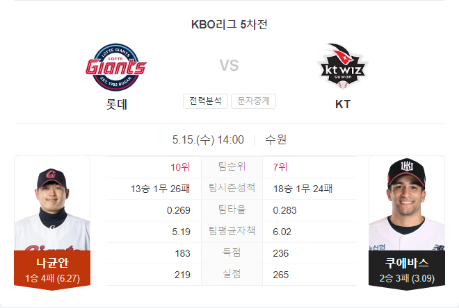 전날 경기에서 롯데는 불펜의 문제를 여지없이 드러내며 무너졌다. 선발에서 확실한 우위를 점하지 못하면 원정 경기가 힘들어진다는 점에서 이번 경기는 KT가 유리하다. 쿠에바스는 최근 좋은 투구를 이어가며 안정적인 모습을 보이고 있는 반면, 나균안은 시즌 내내 기복이 심한 투구를 보여주고 있다.