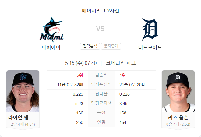 이번 경기는 디트로이트 타이거즈의 우세가 예상됩니다. 리스 올슨은 안정적인 투구를 이어가고 있으며, 마이애미 말린스의 약한 타선을 상대로 좋은 성적을 낼 가능성이 큽니다. 반면, 마이애미 말린스는 라이언 웨더스의 부진과 함께 팀 전체적인 타격에서 어려움을 겪고 있어 고전할 것으로 보입니다.