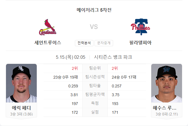 5월 15일 MLB 메이저리그 세인트루이스 카디널스 VS 필라델피아 필리스 1차전 타카짱의 경기 예측 분석