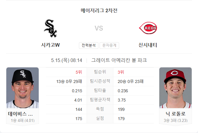 두 팀 모두 전력이 약한 편이나, 결정적인 차이는 홈과 원정 성적에 있습니다. 화이트삭스는 리그 최악의 원정 승률을 기록하고 있으며, 마운드와 타선 모두 불안정한 흐름을 이어가고 있습니다. 반면 신시내티는 닉 로돌로라는 안정적인 선발투수를 앞세워 경기 초반 주도권을 가져올 가능성이 높습니다.