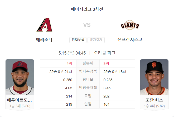 자이언츠가 홈에서 연패를 끊어야 하는 시점이고, 로드리게스를 상대로 라모스, 채프먼 등 중심 타선이 충분히 공략할 수 있는 흐름입니다. 다이아몬드백스는 캐럴 중심의 타선 폭발이 필요하겠지만, 선발에서부터 흐름이 끊길 가능성이 높습니다.