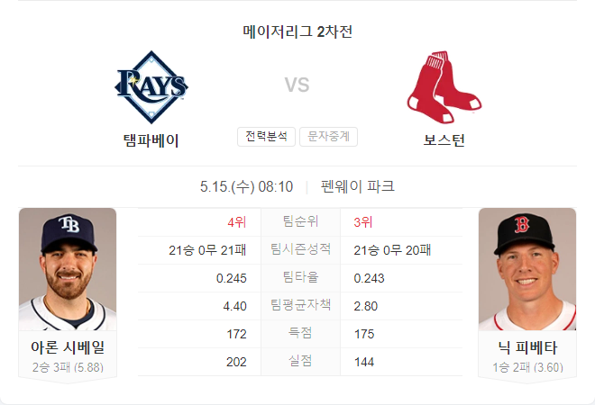 이번 경기는 보스턴 레드삭스의 우세가 예상됩니다. 닉 피베타는 최근 기복이 있지만, 전반적으로 안정적인 투구를 이어가고 있으며, 탬파베이 레이스의 불안정한 타선을 상대로 좋은 성적을 거둘 가능성이 큽니다. 반면, 아론 시발레는 원정 경기에서 부진한 성적을 기록하고 있으며, 보스턴의 강력한 타선을 상대로 어려움을 겪을 것으로 보입니다.