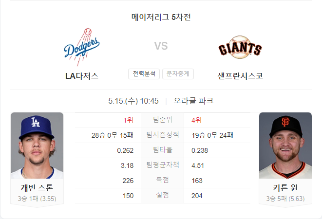 LA 다저스는 샌디에이고 파드리스와의 시리즈에서 어려움을 겪었지만, 이번 경기에서는 상대적으로 부진한 키튼 윈을 상대로 반등할 가능성이 큽니다. 가빈 스톤은 이번 시즌 안정적인 투구를 보여주고 있으며, 최근 경기에서도 좋은 성적을 기록하고 있습니다. 샌프란시스코 자이언츠는 최근 상승세를 타고 있지만, 윈의 최근 부진한 투구가 변수로 작용할 수 있습니다.