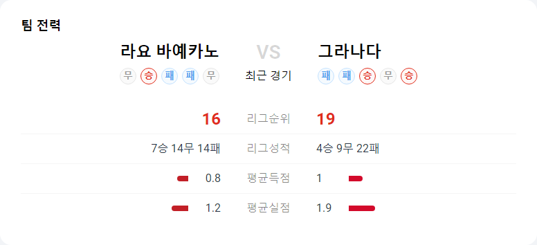 라요 바예카노는 리그 16위에 위치해 있으며, 강등권과의 격차가 좀처럼 벌어지지 않고 있다. 최근 발렌시아 원정에서 0-0 무승부를 기록하며 유의미한 결과를 얻었다. 하지만 남은 경기에서 바르셀로나 원정과 아틀레틱 클루브와의 홈 경기가 남아 있어, 이번 그라나다전을 반드시 잡아야 잔류를 확정 지을 수 있다.