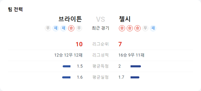 브라이튼은 최근 빈공 문제를 겪고 있으며, 주요 선수들의 결장으로 인해 공격력이 약화된 상태다. 첼시는 최근 3연승을 기록하며 상승세를 타고 있지만, 역습 대처와 일부 수비 자원의 집중력 저하가 문제로 남아 있다. 전반적으로 첼시가 더 안정적인 전력을 보유하고 있으며, 브라이튼의 공격력 부진을 고려할 때 첼시가 승리에 더 가까울 것으로 예상된다.