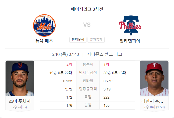 5월 16일 MLB 뉴욕 메츠 VS 필라델피아 필리스 타카짱의 경기 예측 분석