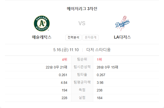5월 16일 MLB 메이저리그 애슬레틱스 VS LA 다저스 타카짱의 경기 예측 분석