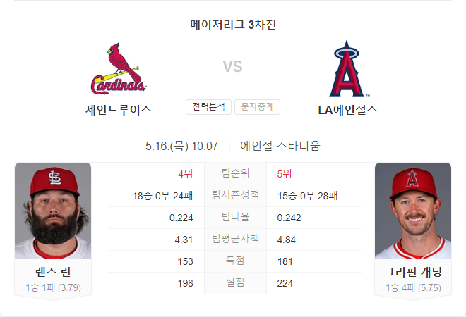 세인트루이스의 타선이 최근 부진을 극복하고 있는 반면, 에인절스의 투수진은 여전히 불안한 모습을 보이고 있습니다. 따라서, 이번 경기는 세인트루이스 카디널스가 승리할 가능성이 높아 보입니다.
