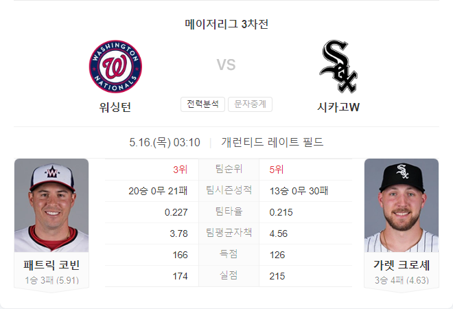 내셔널스가 최근 경기에서 보여준 공격력과 코빈의 기복 있는 투구를 고려할 때, 화이트삭스가 홈에서 우위를 점할 가능성이 큽니다.