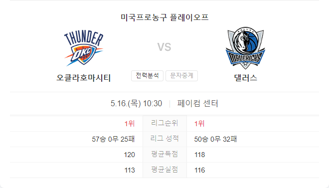 5월 16일 NBA 달라스 매버릭스 VS 오클라호마시티 썬더 타카짱의 경기 예측 분석