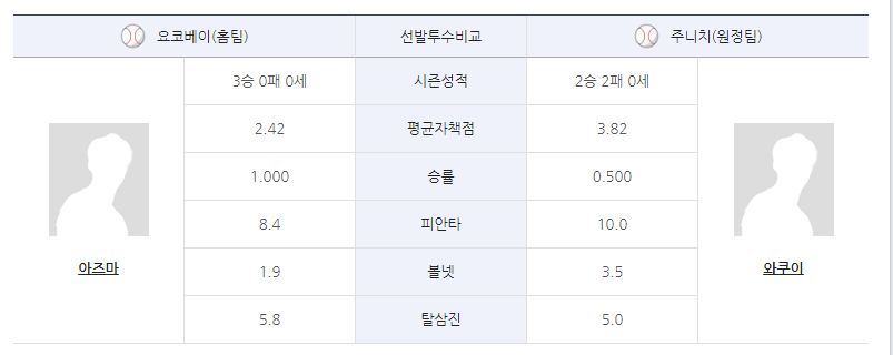 타선의 부진이 3연패로 이어진 요코하마 DeNA 베이스타즈는 아즈마 카츠키(3승 2.42)가 연패 저지를 위해 마운드에 오른다. 10일 한신과의 홈 경기에서 8이닝 3실점의 투구를 보여준 아즈마는 꾸준히 에이스다운 투구를 하고 있다. 작년 주니치 상대로 홈에서 2경기 모두 7이닝 이상 3실점 이하로 승리를 거둔 바 있어 기대를 걸 만하다.