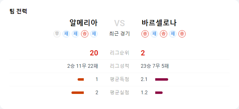 이번 경기에서는 알메리아가 홈에서 강한 압박을 통해 바르셀로나를 괴롭히려 할 가능성이 크다. 그러나 수비적인 불안정성이 문제가 될 수 있다. 바르셀로나는 최근 수비에서의 불안감을 보이고 있지만, 공격에서는 꾸준한 득점력을 유지하고 있어 알메리아의 압박을 효과적으로 극복할 가능성이 크다. 따라서 바르셀로나의 승리가 예상된다.