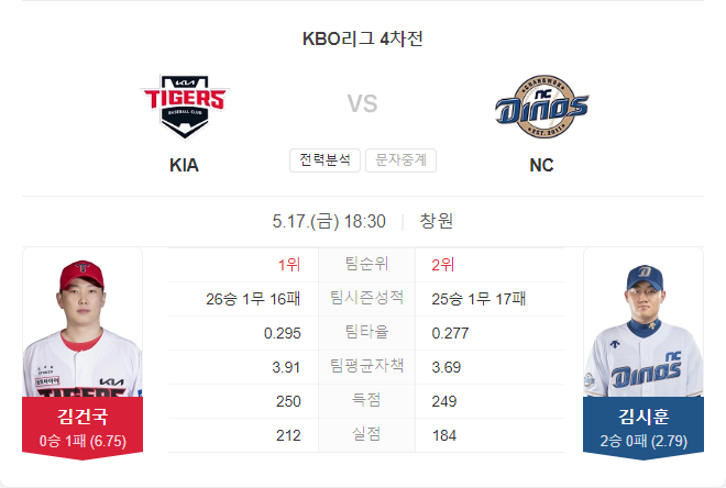 5월 17일 KBO 프로야구 기아 타이거즈 VS NC 다이노스 타카짱의 경기 예측 분석
