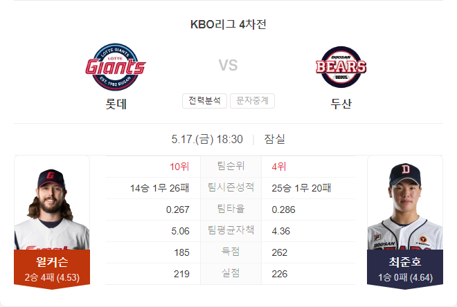 4일 휴식 후 등판하는 최준호 역시 변수이지만, 최근 두산은 접전 시 경기 후반 집중력이 무시무시할 정도이다. 반면, 롯데의 불펜은 언제 무너져도 이상하지 않다. 경기의 뒷심에서 앞선 두산이 승리에 가까워 보인다.