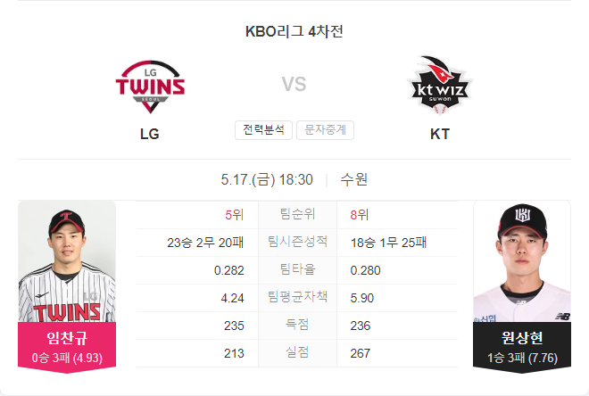 전날 양 팀은 모두 야수진의 집중력 부족으로 패배했다는 공통점이 있다. 다른 점이라면 KT는 완봉패를 당한 반면, LG는 나름 타선이 터져주었다는 점이다. 게다가 원상현과 임찬규는 선발로서의 레벨 차이가 있고, 불펜 안정감도 LG가 더 낫다. 슬슬 임찬규도 승리 투수가 될 때가 됐다. 투수력에서 앞선 LG가 승리에 가까워 보인다.