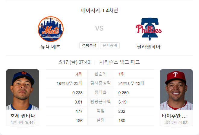 뉴욕 메츠는 현재 시즌에서 19승 22패를 기록하고 있으며, 이번 시리즈에서 필라델피아 필리스에게 3연패를 당했다. 메츠의 선발 투수 호세 퀸타나는 최근 경기에서 부진한 모습을 보이며 4.82의 ERA를 기록하고 있다. 퀸타나는 최근 4경기에서 18실점을 허용하며 불안한 투구를 이어가고 있다.