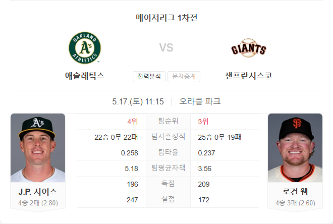 5월 17일 MLB 메이저리그 애슬레틱스 VS 샌프란시스코 자이언츠 타카짱의 경기 예측 분석