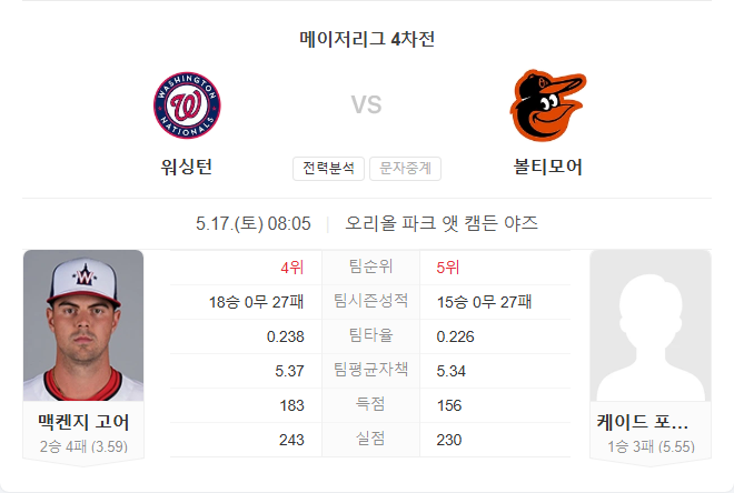 워싱턴이 원정 경기이긴 하나, 고어의 안정감과 볼티모어의 무기력한 타선을 감안할 때 선발 매치업에서 확연한 우위를 점하고 있습니다. 타선에서도 최소한의 점수를 지원할 수 있다면 내셔널스가 승리를 가져갈 가능성이 높아 보입니다.