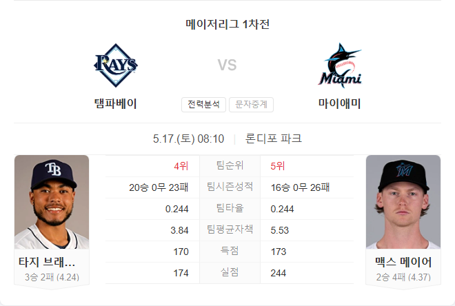 탬파베이는 이동 거리가 길고 체력 부담이 있지만, 타선의 짜임새와 브래들리의 안정적인 피칭 흐름이 강점입니다. 마이애미는 휴식일을 활용해 체력적으로는 유리하지만, 마이어가 최근 실점이 많아 불안 요소로 작용합니다.