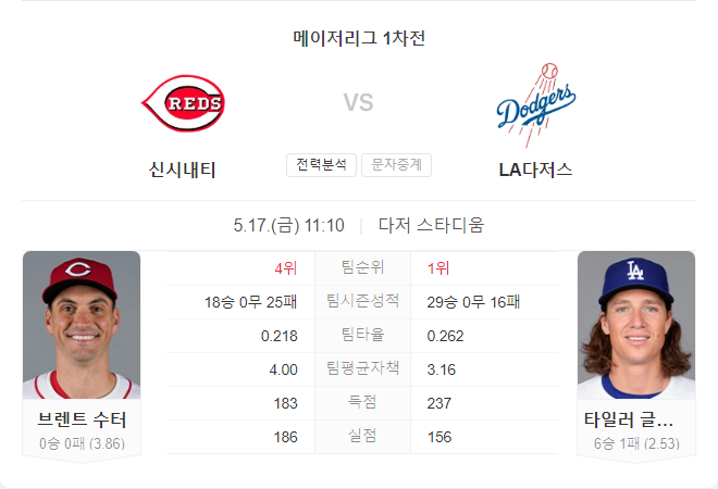이번 경기에서는 LA 다저스가 우세할 것으로 예상된다. 다저스는 타일러 글라스노우의 안정적인 투구와 강력한 타선으로 신시내티 레즈를 압도할 가능성이 크다.