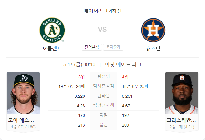 오클랜드의 조이 에스테스는 첫 등판에서 좋은 성적을 기록했지만, 휴스턴의 강력한 타선을 상대로는 어려움을 겪을 수 있다. 두 팀 모두 최근 타격 성적이 좋기 때문에 경기는 다득점 경기가 될 가능성이 크다.