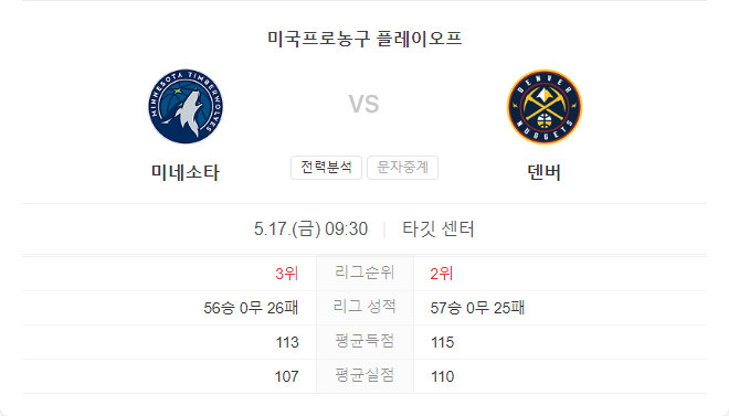 덴버 너겟츠는 서부 컨퍼런스 준결승에서 미네소타 팀버울브스를 상대로 3연승을 거두며 우세한 위치에 있다. 최근 경기에서 첫 홈 승리를 기록한 덴버는 니콜라 요키치의 MVP 수상 후 40득점, 13어시스트, 7리바운드의 활약으로 112-97로 승리하며 4.5점 차이로 스프레드를 커버했다.