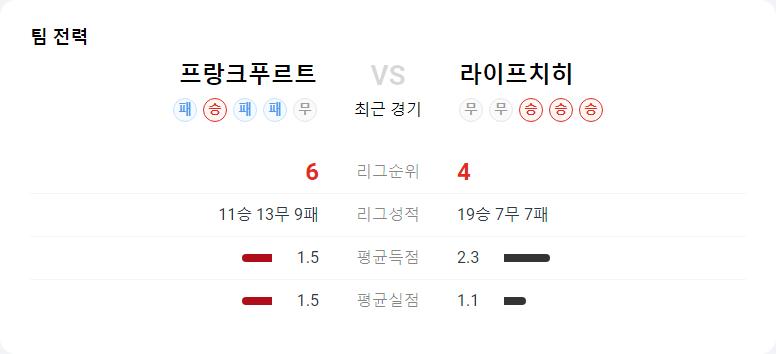 아인트라흐트 프랑크푸르트는 현재 리그 6위에 위치해 있으며, 최근 5경기에서 1승 1무 3패를 기록하고 있습니다. 7위 호펜하임과 승점 및 득실차가 3점 차이로, 경쟁이 치열한 상황입니다. 남은 일정은 RB 라이프치히와의 경기로 쉽지 않은 상황입니다. 최근 3경기 동안 3득점 8실점으로 성적이 불만족스러우며, 파초(CB)와 코흐(CB) 조합은 여전히 불안합니다.
