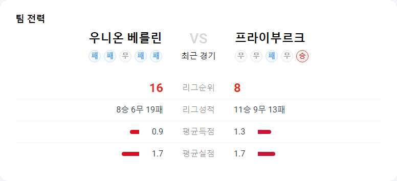 우니온 베를린은 현재 리그 16위에 위치해 있으며, 최근 5경기에서 1무 4패를 기록하고 있습니다. 직전 경기에서 쾰른에게 2-3으로 패배하며 후반 막판 연이은 헤더골로 경기를 내준 것은 팀의 의지를 크게 꺾었습니다. 현재 다이렉트 강등의 가능성이 높아져 반드시 승리해야 잔류를 확정 지을 수 있는 상황입니다.