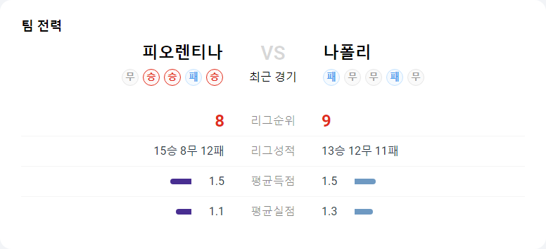 피오렌티나는 현재 이탈리아 1부 리그에서 8위를 기록 중이며, 최근 5경기에서 3승 1무 1패로 좋은 성적을 거두고 있습니다. 나폴리를 상대로도 비교적 잘 싸웠던 팀입니다. 다만, 박스 안에서의 수비가 부실하여 상대의 공세를 완벽히 막아내지는 못하지만, 중원에서의 장악력과 에너지 레벨이 높아 상대와의 중원 싸움에서는 쉽게 지지 않는 편입니다.