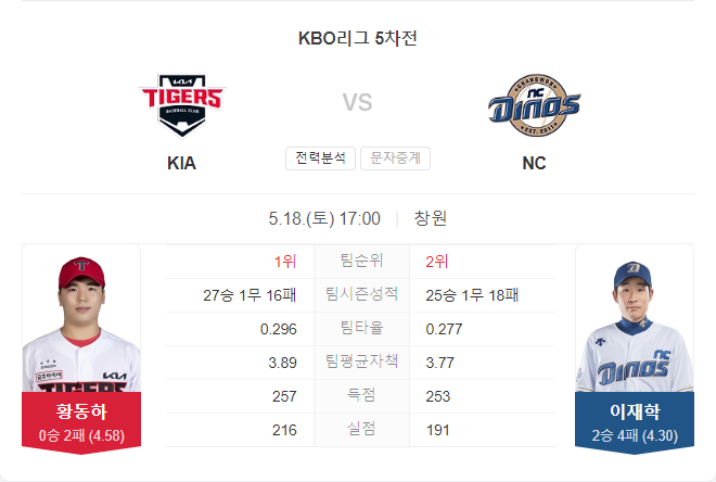 5월 18일 KBO 프로야구 기아 타이거즈 VS NC 다이노스 타카짱의 경기 예측 분석