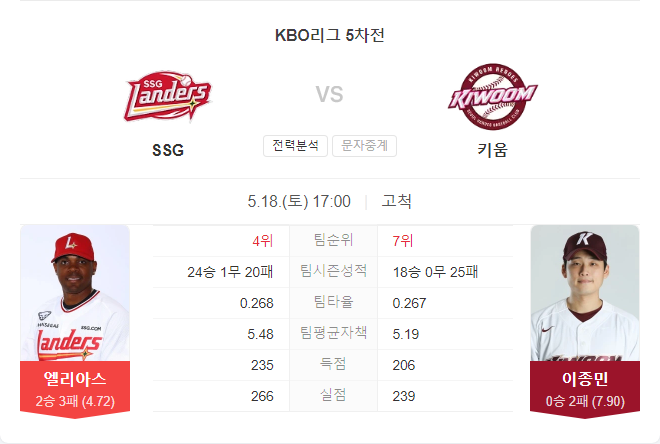 SSG 랜더스는 전날 경기에서 에레디아의 놀라운 수비를 앞세워 신승을 거두었습니다. 이번 경기에서는 로에니스 엘리아스가 선발 등판하여 연승에 도전합니다. 엘리아스는 지난 12일 KIA 원정에서 5이닝 2실점의 투구를 보여주었으며, 4월 11일 키움과의 홈 경기에서는 6.1이닝 5실점으로 패배한 바 있습니다.