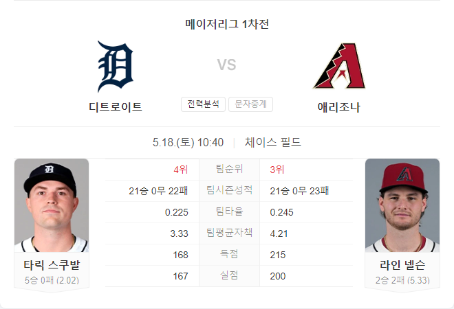 이번 경기는 두 팀의 선발 투수 대결이 될 것입니다. 디트로이트 타이거즈의 타릭 스쿠발은 시즌 초반부터 뛰어난 성적을 기록하며 팀의 승리를 이끌고 있습니다. 반면, 애리조나 다이아몬드백스의 라이언 넬슨은 최근 다소 부진한 모습을 보였지만, 강력한 타선의 지원을 받을 수 있습니다.