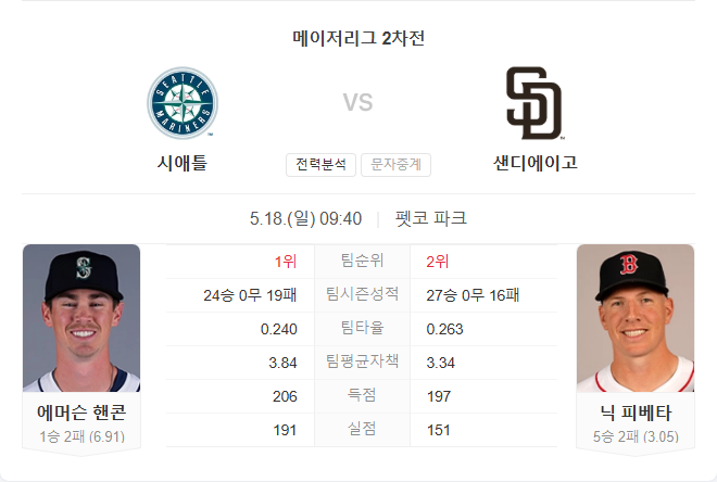 시애틀은 최근 하락세와 부상자 공백, 미정 선발이라는 불확실성 속에 어렵게 경기를 치르게 될 것으로 보입니다. 반면 샌디에이고는 타선과 마운드 모두에서 꾸준한 퍼포먼스를 유지하고 있으며, 닉 피베타가 안정적인 선발로 나서며 우위를 점할 전망입니다.