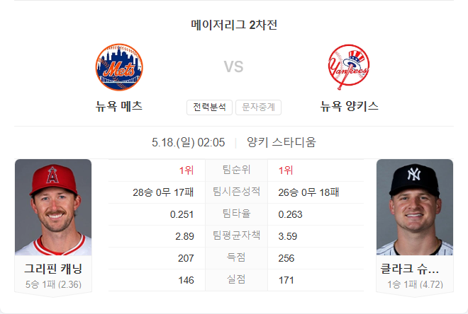 캐닝이 초반부터 양키스 타선을 억제할 수 있다면 메츠가 흐름을 바꿀 가능성도 있지만, 슈미트가 제 몫을 해주고 불펜이 뒷받침된다면 양키스가 시리즈 승리를 조기 확정 지을 것으로 보입니다.