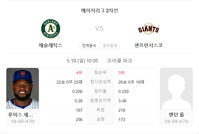 문제는 마운드입니다. 평균 실점 5.61점(28위), 피안타율 0.266(26위), 팀 평균자책점 5.18(26위), WHIP 1.50(28위)로 투수진이 리그 최하위권에 머물고 있습니다. 토요일 경기 선발은 루이스 세베리노로, 시즌 1승 4패, 평균자책점 4.70을 기록 중입니다. 직전 등판에서는 뉴욕 양키스를 상대로 4이닝 8실점하며 조기 강판됐습니다. 샌프란시스코 상대 전적은 2경기에서 평균자책점 2.77로 상대적으로 좋은 기억이 있습니다.