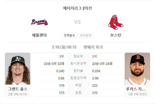 브레이브스는 타선이 침묵하고 있음에도 불구하고 강력한 선발과 불펜진 덕분에 꾸준한 승수를 쌓고 있습니다. 홈즈는 최근 안정적인 피칭 흐름을 보이고 있어 기대할 만하며, 레드삭스 타선의장타력을 어느 정도 억제할 수 있다면 충분히 승산이 있습니다. 반면 레드삭스는 지올리토가 브레이브스에 유난히 약한 전적을 가지고 있으며, 최근 투수진 전체의 불안감도 해소되지 않았습니다.