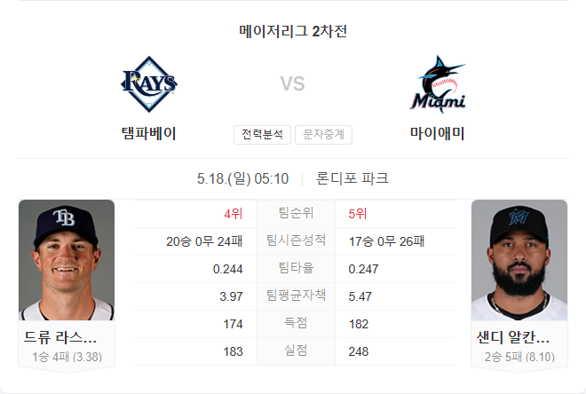 레이스는 디아즈와 로우 형제의 복귀로 타선의 무게감이 확실히 살아났고, 전력상 말린스보다 우세한 위치에 있습니다. 라스무센이 안정적인 피칭을 해준다면, 타선이 충분히 득점 지원을 해줄 수 있는 환경입니다.