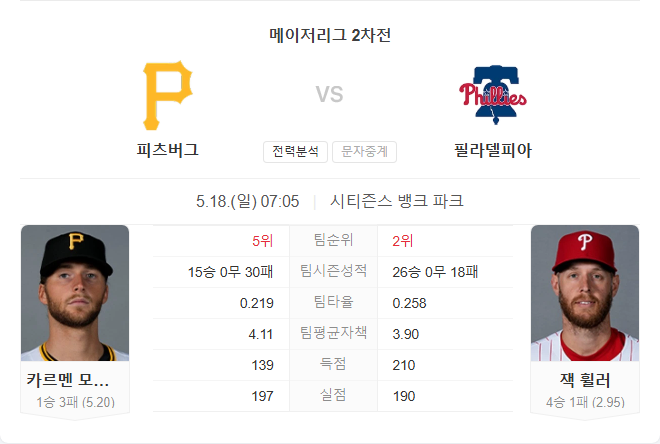 5월 18일 MLB 메이저리그 피츠버그 파이어리츠 VS 필라델피아 필리스 타카짱의 경기 예측 분석