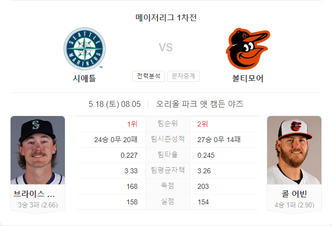 시애틀 매리너스와 볼티모어 오리올스의 경기는 치열한 승부가 예상됩니다. 시애틀은 최근 좋은 흐름을 이어가고 있으며, 브라이스 밀러가 안정적인 선발 투수로 나섭니다. 반면, 볼티모어는 홈에서 강한 모습을 보이며 콜 어빈의 안정적인 투구로 기대를 모으고 있습니다. 두 팀 모두 선발 투수가 좋은 성적을 기록하고 있어 접전이 예상됩니다.
