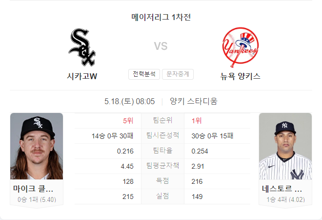 시카고 화이트삭스는 최근 좋은 흐름을 이어가고 있지만, 뉴욕 양키스의 홈 경기에서는 어려운 경기가 예상됩니다. 양키스는 최근 타격과 투수에서 안정적인 모습을 보이고 있으며, 특히 네스터 코르테스는 홈 경기에서 강한 모습을 보이고 있습니다.
